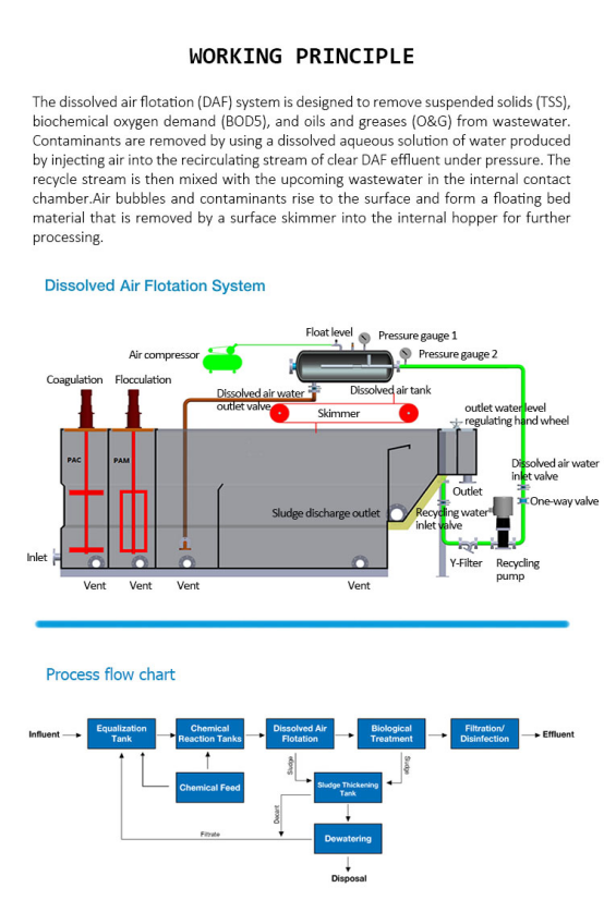 Dissolved air flotation is composed of DAF tank , air dissolving system , dissolved air return pipeline , dissolved air water release device , skimming system and electric control cabinet.